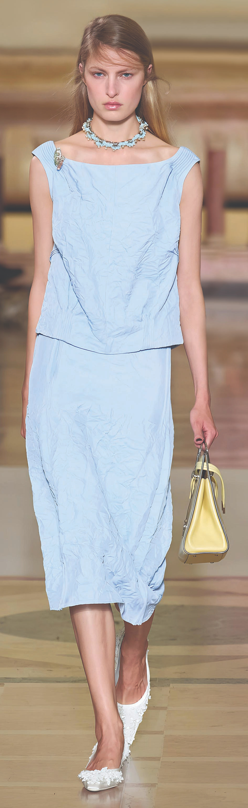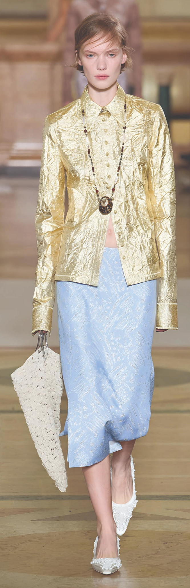 Không chạy theo trào lưu quần ống phồng thập niên 1980 vốn xuất hiện dày đặc trên các sàn diễn, Tory Burch khơi dậy tinh thần thập niên 1990 với quần cạp trễ gợi nhớ đến thời kỳ khởi đầu của bà trong ngành thời trang. Váy cũng được xử lý với nhiều biến tấu: dáng bút chì ôm sát hay dáng xòe rộng đều được làm mới bằng chi tiết bất đối xứng và thắt lưng to bản. Một thiết kế khác gây chú ý là áo len thêu thủ công với chữ cái viết tắt của các thành viên trong studio vừa mang tính biểu tượng tập thể, vừa gợi cảm hứng cho trào lưu DIY đang được giới trẻ quan tâm.